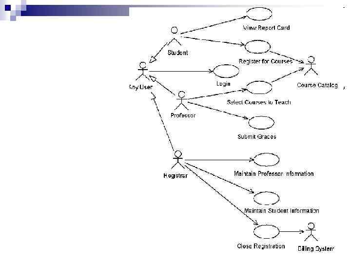 Пример задания по UML • Задание 1 Построить диаграмму вариантов использования (либо несколько диаграмм) в соответствии с представленным описанием. Диаграмма должна содержать не менее 3 актеров и не менее 5 вариантов использования для каждого из них. • Задание 2 Построить диаграмму классов в соответствии с представленным описанием. Диаграмма должна содержать не менее 5 классов, большинство классов должны содержать как атрибуты, так и методы.
