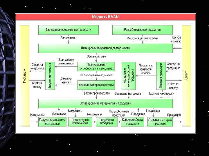 2) Модель BAAN, применяется специалистами по внедрению интегрированных информационных систем, делит бизнеспроцессы на основные и управленческие. При этом под основными процессами понимаются все процессы по перемещению или преобразованию материальных потоков. Бизнес-процессы по перемещению или преобразованию информационных потоков относят к группе управленческих.