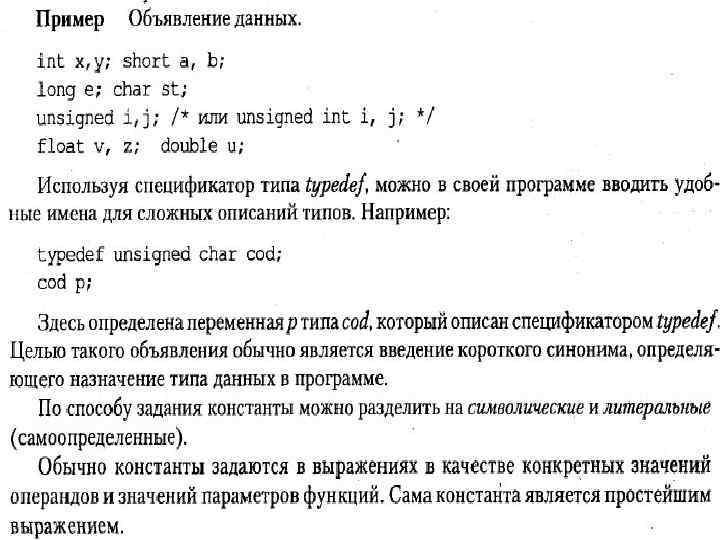 Идентификаторы - это имена переменных, функций и меток, используемых в программе, создаются объявлением соответствующих переменныых или функций, далее можно использовать в последующих операторах программы. Идентификатор - это последовательность из одной или более букв, цифр или подчерков(_), которая начинается с буквы или подчерка. Допускается любое число символов в идентификаторе, однако только первые 31 символ распознаются компилятором ( а линковвщик может распознавать меньше!!!). Осторожно, подчерк!!! Идентификаторы, начинающиеся с подчерка, могут войти в конфликт с именами "скрытых" системных программ.