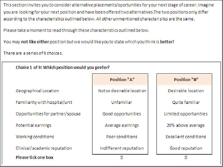 Discreet choice experiments (DCE)9 -11 • Present choice sets drawn from all possible choice sets of alternatives • Based on consumer theory, that when faced with different choices, people put value on particular (stable) preferences