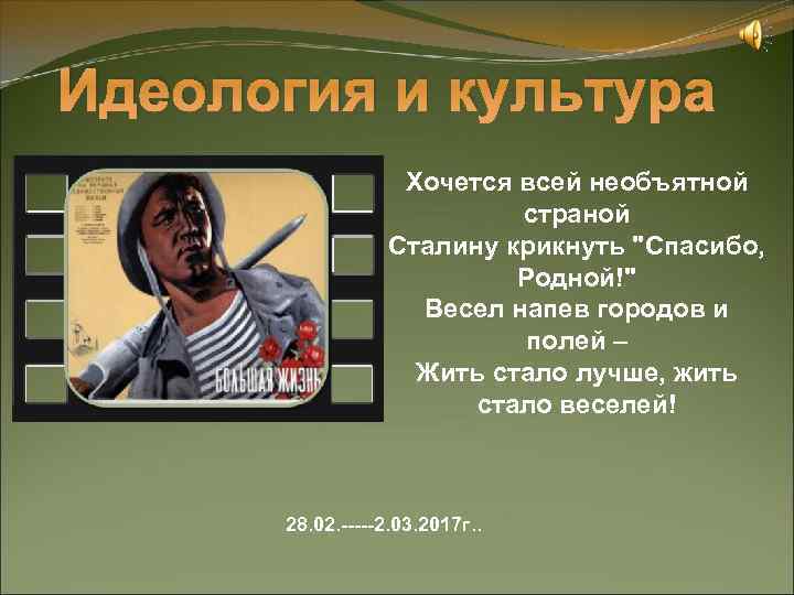 Идеология и культура Хочется всей необъятной страной Сталину крикнуть "Спасибо, Родной!" Весел напев городов и полей – Жить стало лучше, жить стало веселей! 28. 02. -----2. 03. 2017 г. .