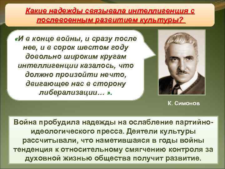 Какие надежды связывала интеллигенция с Восстановление «железного занавеса» послевоенным развитием культуры? «Ив конце войны, и сразу после нее, и в сорок шестом году довольно широким кругам интеллигенции казалось, что должно произойти нечто, двигающее нас в сторону либерализации… » . К. Симонов Война пробудила надежды на ослабление партийно- идеологического пресса. Деятели культуры рассчитывали, что наметившаяся в годы войны тенденция к относительному смягчению контроля за духовной жизнью общества получит развитие.