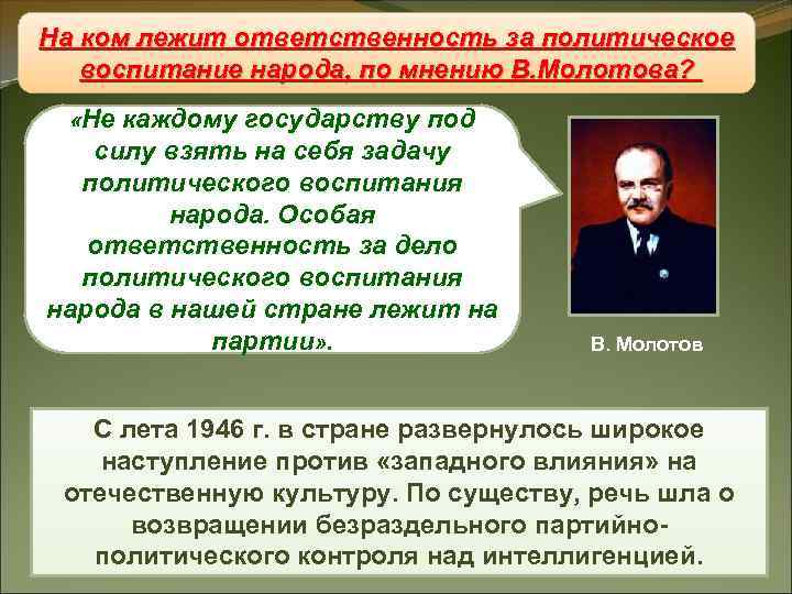 На ком лежит ответственность за политическое Вспомните, каковы были основные задачи в Восстановление «железного занавеса» воспитание народа, по мнению В. Молотова? области культуры в 30 -е гг. ? «Не каждому государству под силу взять на себя задачу политического воспитания народа. Особая ответственность за дело политического воспитания народа в нашей стране лежит на партии» . В. Молотов С лета 1946 г. в стране развернулось широкое наступление против «западного влияния» на отечественную культуру. По существу, речь шла о возвращении безраздельного партийно- политического контроля над интеллигенцией.