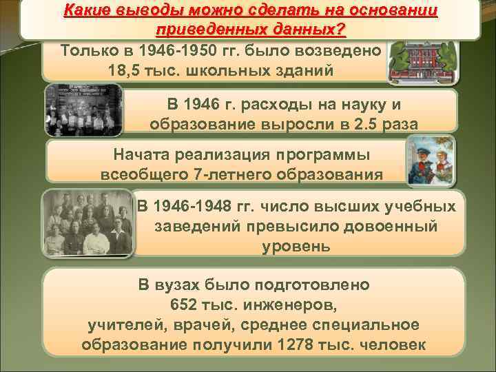 Какие выводы можно сделать на основании Образование приведенных данных? Только в 1946 -1950 гг. было возведено 18, 5 тыс. школьных зданий В 1946 г. расходы на науку и образование выросли в 2. 5 раза Начата реализация программы всеобщего 7 -летнего образования В 1946 -1948 гг. число высших учебных заведений превысило довоенный уровень В вузах было подготовлено 652 тыс. инженеров, учителей, врачей, среднее специальное образование получили 1278 тыс. человек