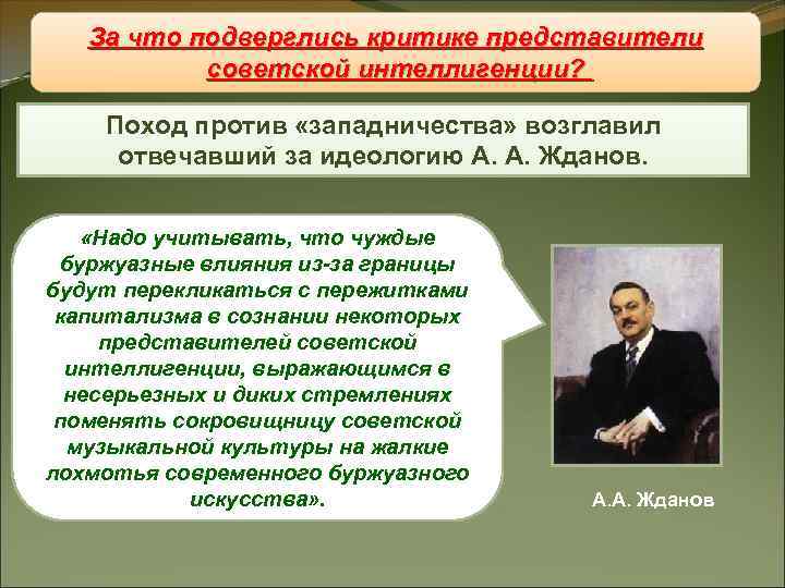 За что подверглись критике представители Восстановление интеллигенции? советской «железного занавеса» Поход против «западничества» возглавил отвечавший за идеологию А. А. Жданов. «Надо учитывать, что чуждые буржуазные влияния из-за границы будут перекликаться с пережитками капитализма в сознании некоторых представителей советской интеллигенции, выражающимся в несерьезных и диких стремлениях поменять сокровищницу советской музыкальной культуры на жалкие лохмотья современного буржуазного искусства» . А. А. Жданов