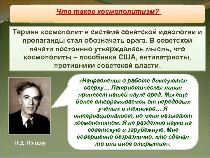 Что такое космополитизм? Восстановление «железного занавеса» Термин космополит в системе советской идеологии и пропаганды стал обозначать врага. В советской печати постоянно утверждалась мысль, что космополиты – пособники США, антипатриоты, противники советской власти. «Направления в работе диктуются сверху… Патриотическая линия принесет нашей науке вред. Мы еще более отгораживаемся от передовых ученых и техников… Я интернационалист, но меня называют космополитом. Я не разделяю науки на советскую и зарубежную. Мне совершенно безразлично, кто сделал Л. Д. Ландау то или иное открытие» .