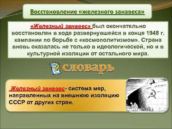 Восстановление «железного занавеса» «Железный занавес» был окончательно восстановлен в ходе развернувшейся в конце 1948 г. кампании по борьбе с «космополитизмом» . Страна вновь оказалась не только в идеологической, но и в культурной изоляции от остального мира. Железный занавес- система мер, занавес направленных на внешнюю изоляцию СССР от других стран.
