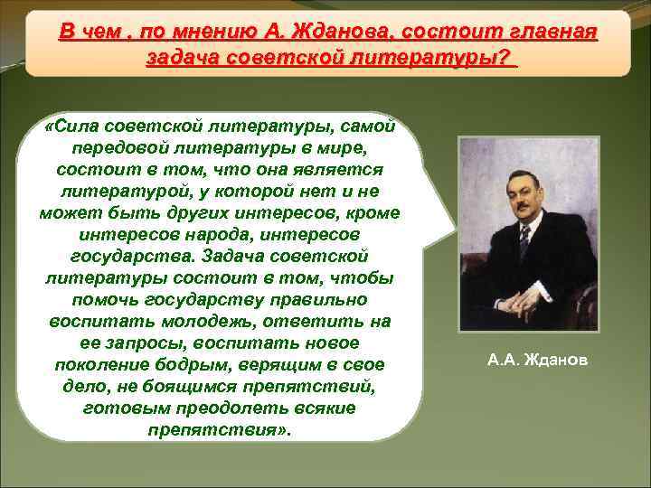 В чем , по мнению А. Жданова, состоит главная Восстановление «железного занавеса» задача советской литературы? «Сила советской литературы, самой передовой литературы в мире, состоит в том, что она является литературой, у которой нет и не может быть других интересов, кроме интересов народа, интересов государства. Задача советской литературы состоит в том, чтобы помочь государству правильно воспитать молодежь, ответить на ее запросы, воспитать новое поколение бодрым, верящим в свое А. А. Жданов дело, не боящимся препятствий, готовым преодолеть всякие препятствия» .
