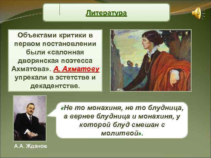 Литература Объектами критики в первом постановлении были «салонная дворянская поэтесса Ахматова» . А. Ахматову упрекали в эстетстве и декадентстве. «Нето монахиня, не то блудница, а вернее блудница и монахиня, у которой блуд смешан с молитвой» . А. А. Жданов