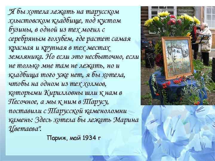 "Я бы хотела лежать на тарусском хлыстовском кладбище, под кустом бузины, в одной из тех могил с серебряным голубем, где растет самая красная и крупная в тех местах земляника. Но если это несбыточно, если не только мне там не лежать, но и кладбища того уже нет, я бы хотела, чтобы на одном из тех холмов, которыми Кирилловны шли к нам в Песочное, а мы к ним в Тарусу, поставили с Тарусской каменоломни камень: Здесь хотела бы лежать Марина Цветаева". Париж, май 1934 г