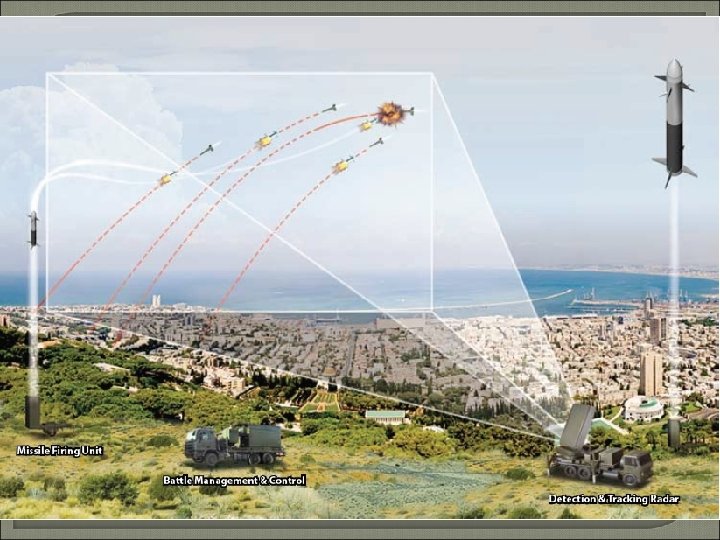 Iron Dome Izrael úspěšně otestoval funkční prototyp nového obranného systému Iron Dome, určený k současnému ničení až několika dělostřeleckých projektilů a raket krátkého dosahu Schopen ničit rakety ve vzdálenostech od 4 do 70 kilometrů. Nyní je již vyvíjena verze systému Iron Dome, použitelná proti balistickým raketám středního a velkého dosahu a řízeným střelám s plochou dráhou letu. Rafael Advanced Defense Systems, Ltd. na základě uděleného kontraktu v hodnotě 200 milionů dolarů. Mobilní systém Iron Dome pracuje zcela automaticky a vyznačuje se velmi krátkou dobou reakce. Hlavními prvky obranného systému jsou • přesný sledovací radar, • středisko řízení bojové činnosti a řízení palby, • antirakety se speciálními bojovými hlavicemi a jednotka s odpalovacími zařízeními.