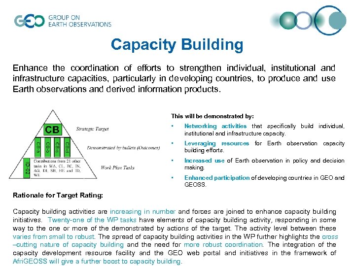 Capacity Building Enhance the coordination of efforts to strengthen individual, institutional and infrastructure capacities, particularly in developing countries, to produce and use Earth observations and derived information products. This will be demonstrated by: • Networking activities that specifically build individual, institutional and infrastructure capacity. • Leveraging resources for Earth observation capacity building efforts. • Increased use of Earth observation in policy and decision making. • Enhanced participation of developing countries in GEO and GEOSS. Rationale for Target Rating: Capacity building activities are increasing in number and forces are joined to enhance capacity building initiatives. Twenty-one of the WP tasks have elements of capacity building activity, responding in some way to the one or more of the demonstrated by actions of the target. The activity level between these varies from small to robust. The spread of capacity building activities in the WP further highlights the cross –cutting nature of capacity building and the need for more robust coordination. The integration of the capacity development resource facility and the GEO web portal and initiatives in the framework of Afri. GEOSS will give a further boost to capacity building.