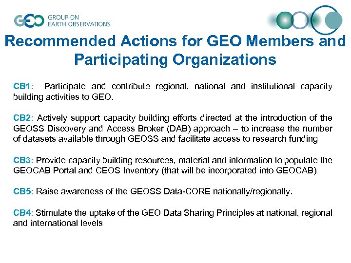 Recommended Actions for GEO Members and Participating Organizations CB 1: Participate and contribute regional, national and institutional capacity building activities to GEO. CB 2: Actively support capacity building efforts directed at the introduction of the GEOSS Discovery and Access Broker (DAB) approach – to increase the number of datasets available through GEOSS and facilitate access to research funding CB 3: Provide capacity building resources, material and information to populate the GEOCAB Portal and CEOS Inventory (that will be incorporated into GEOCAB) CB 5: Raise awareness of the GEOSS Data-CORE nationally/regionally. CB 4: Stimulate the uptake of the GEO Data Sharing Principles at national, regional and international levels