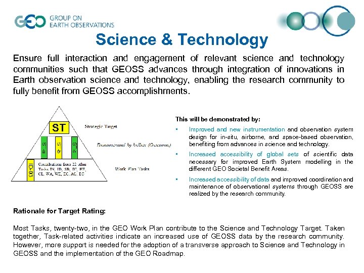 Science & Technology Ensure full interaction and engagement of relevant science and technology communities such that GEOSS advances through integration of innovations in Earth observation science and technology, enabling the research community to fully benefit from GEOSS accomplishments. This will be demonstrated by: • Improved and new instrumentation and observation system design for in-situ, airborne, and space-based observation, benefiting from advances in science and technology. • Increased accessibility of global sets of scientific data necessary for improved Earth System modelling in the different GEO Societal Benefit Areas. • Increased accessibility of data and improved coordination and maintenance of observational systems through GEOSS are realized by the research community. Rationale for Target Rating: Most Tasks, twenty-two, in the GEO Work Plan contribute to the Science and Technology Target. Taken together, Task-related activities indicate an increased use of GEOSS data by the research community. However, more support is needed for the adoption of a transverse approach to Science and Technology in GEOSS and the implementation of the GEO Roadmap.