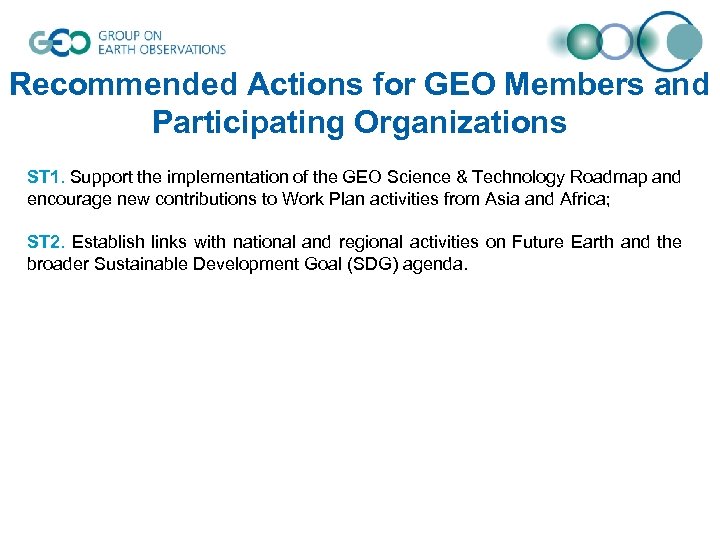 Recommended Actions for GEO Members and Participating Organizations ST 1. Support the implementation of the GEO Science & Technology Roadmap and encourage new contributions to Work Plan activities from Asia and Africa; ST 2. Establish links with national and regional activities on Future Earth and the broader Sustainable Development Goal (SDG) agenda.