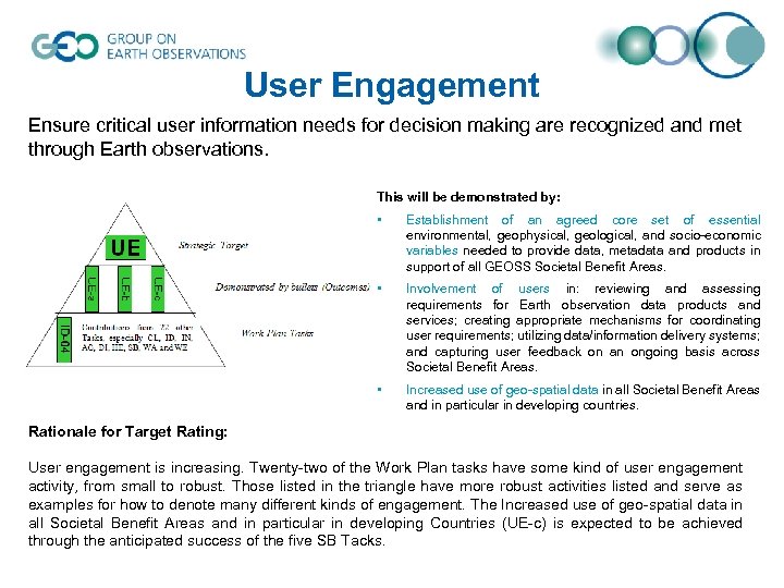 User Engagement Ensure critical user information needs for decision making are recognized and met through Earth observations. This will be demonstrated by: • Establishment of an agreed core set of essential environmental, geophysical, geological, and socio-economic variables needed to provide data, metadata and products in support of all GEOSS Societal Benefit Areas. • Involvement of users in: reviewing and assessing requirements for Earth observation data products and services; creating appropriate mechanisms for coordinating user requirements; utilizing data/information delivery systems; and capturing user feedback on an ongoing basis across Societal Benefit Areas. • Increased use of geo-spatial data in all Societal Benefit Areas and in particular in developing countries. Rationale for Target Rating: User engagement is increasing. Twenty-two of the Work Plan tasks have some kind of user engagement activity, from small to robust. Those listed in the triangle have more robust activities listed and serve as examples for how to denote many different kinds of engagement. The Increased use of geo-spatial data in all Societal Benefit Areas and in particular in developing Countries (UE-c) is expected to be achieved through the anticipated success of the five SB Tacks.