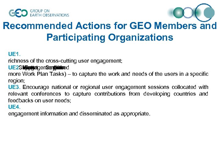 Recommended Actions for GEO Members and Participating Organizations UE 1. richness of the cross-cutting user engagement; UE 2. least Support Session User one Engagementper at year or to (linked one more Work Plan Tasks) – to capture the work and needs of the users in a specific region; UE 3. Encourage national or regional user engagement sessions collocated with relevant conferences to capture contributions from developing countries and feedbacks on user needs; UE 4. engagement information and disseminated as appropriate.