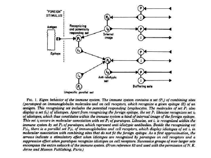 Н. Ерне • сформулировал свою идею на основе трех основных свойств иммунной системы: 1) репертуар антигенсвязывающих сайтов в нормальном организме экстремально огромен; 2) молекулы антител могут распознавать чужие эпитопы и быть распознаны сами другими лимфоцитами; 3) критическая роль супрессии в иммунной системе.
