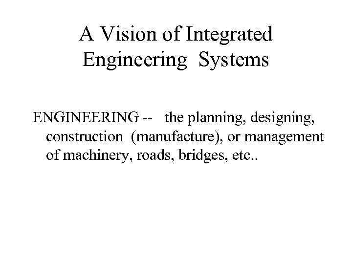 A Vision of Integrated Engineering Systems ENGINEERING -- the planning, designing, construction (manufacture), or management of machinery, roads, bridges, etc. .