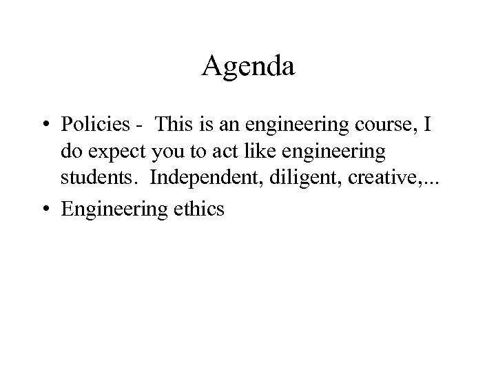 Agenda • Policies - This is an engineering course, I do expect you to act like engineering students. Independent, diligent, creative, . . . • Engineering ethics