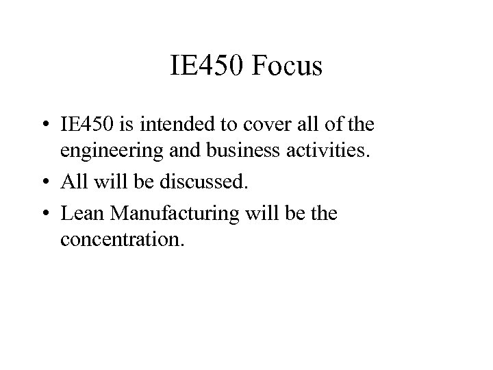 IE 450 Focus • IE 450 is intended to cover all of the engineering and business activities. • All will be discussed. • Lean Manufacturing will be the concentration.