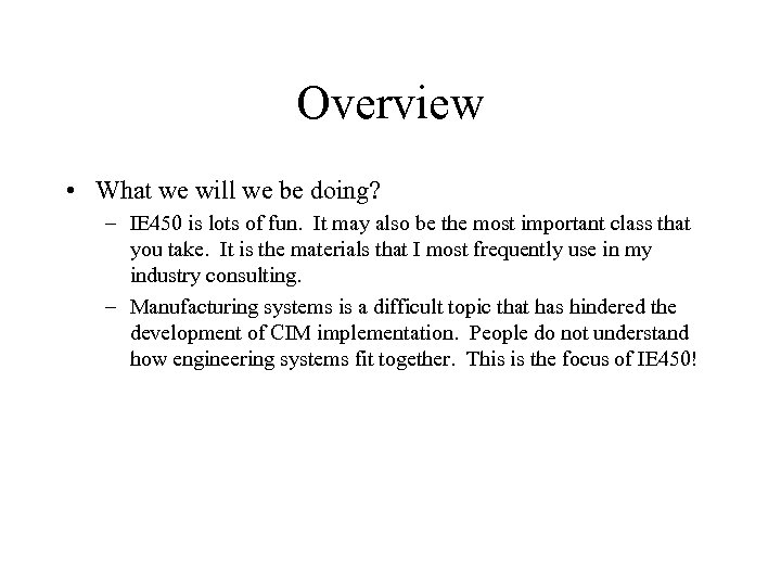 Overview • What we will we be doing? – IE 450 is lots of fun. It may also be the most important class that you take. It is the materials that I most frequently use in my industry consulting. – Manufacturing systems is a difficult topic that has hindered the development of CIM implementation. People do not understand how engineering systems fit together. This is the focus of IE 450!