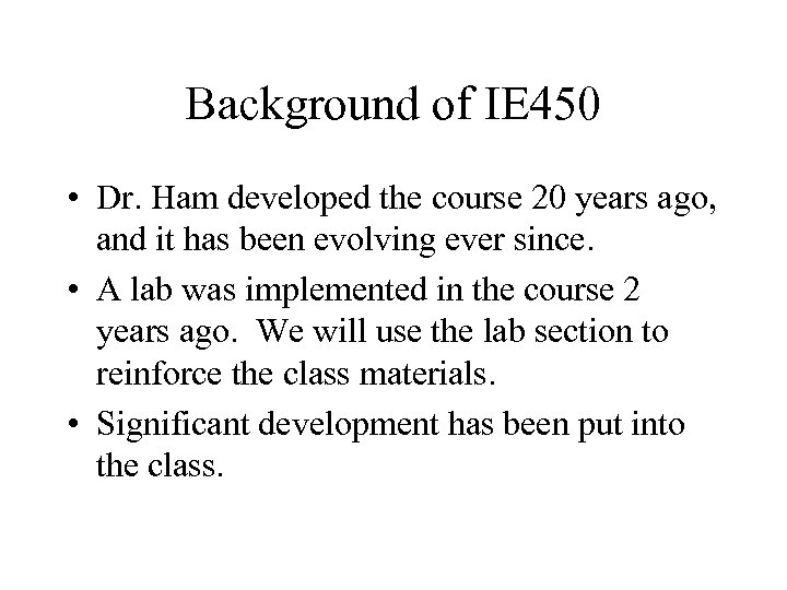 Background of IE 450 • Dr. Ham developed the course 20 years ago, and it has been evolving ever since. • A lab was implemented in the course 2 years ago. We will use the lab section to reinforce the class materials. • Significant development has been put into the class.