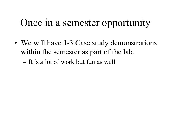 Once in a semester opportunity • We will have 1 -3 Case study demonstrations within the semester as part of the lab. – It is a lot of work but fun as well