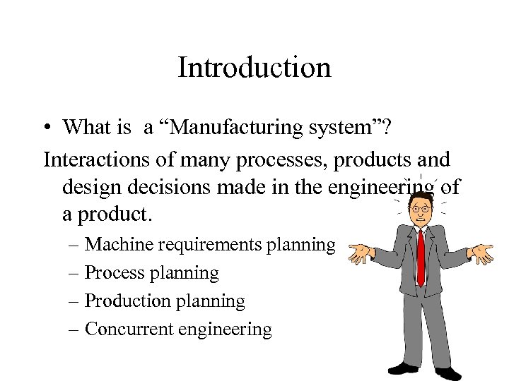 Introduction • What is a “Manufacturing system”? Interactions of many processes, products and design decisions made in the engineering of a product. – Machine requirements planning – Process planning – Production planning – Concurrent engineering