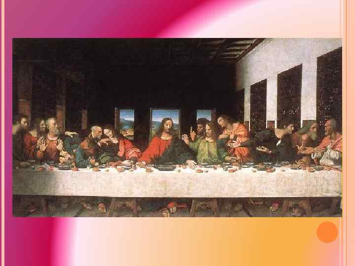 СПИСОК ЖИВОПИСНЫХ ПРОИЗВЕДЕНИЙ Тайная вечеря В трапезной монастыря Санта-Мария делле Грацие Леонардо создает роспись "Тайная вечеря" Высокое религиозно-этическое содержание образа, где представлена бурная, разноречивая реакция учеников Христа на его слова о грядущем предательстве, выражено в четких математических закономерностях композиции, властно подчиняющей себе не только нарисованное, но и реальное архитектурное пространство. Ясная сценическая логика мимики и жестов, а также волнующе-парадоксальное, как всегда у Леонардо, сочетание строгой рациональности с неизъяснимой тайной сделали "Тайную вечерю" одним из самых значительных произведений в истории мирового искусства. Занимаясь также архитектурой, Леонардо разрабатывает различные варианты "идеального города" и центрально-купольного храма.