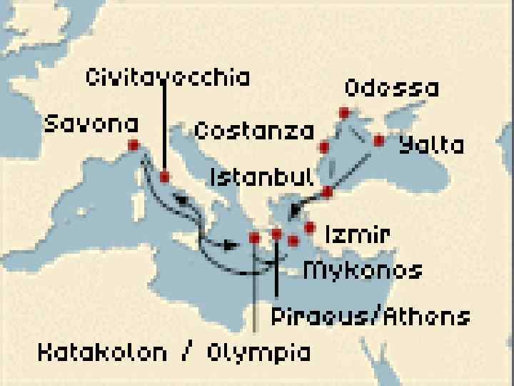Маршрут День 1 2 3 4 5 6 7 8 9 10 11 12 13 14 Порт Страна Прибытие Отправление Савона Италия 16: 30 в море Катаколон Греция 14: 00 19: 00 Миконос Греция 14: 00 23: 00 Измир Турция 07: 30 14: 00 Стамбул Турция 08: 00 19: 00 Констанца Румыния 08: 00 19: 30 Одесса Украина 09: 00 18: 00 Ялта Украина 08: 00 18: 00 в море Пирей Греция 08: 00 14: 00 в море Чивитавеккья Италия 09: 00 19: 00 Савона Италия 09: 00 -