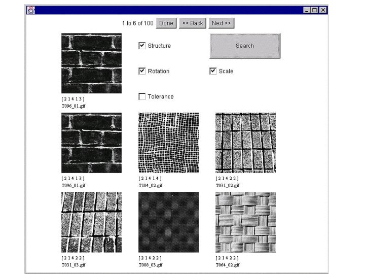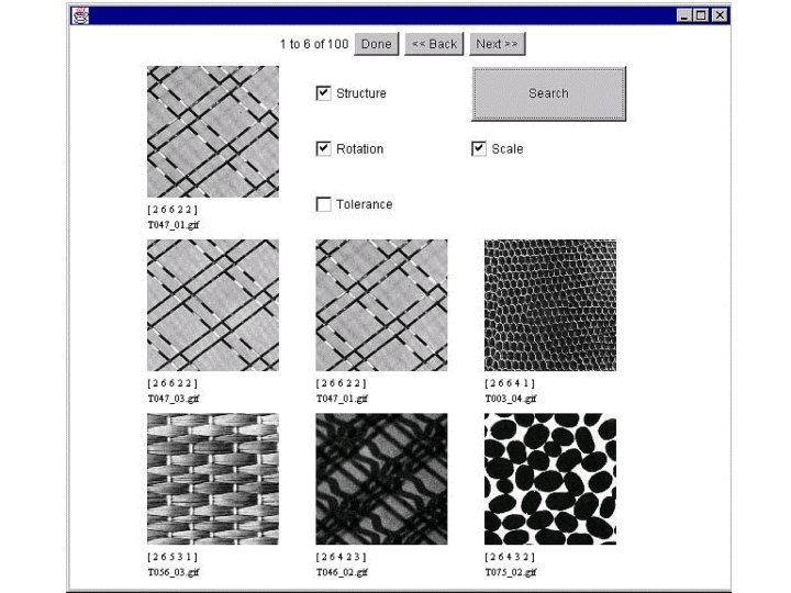 E. g. : Browsing large aerial photographs n n n n 40 large aerial photographs (each is 5 K x 5 K) Contain about 280, 000 tiles and 6, 000 regions Texture based search (using Gabor texture features) A pattern thesaurus for image indexing Fast image segmentation scheme Provide both tile-based and region-based search capabilities. Integrated into the UCSB Alexandria Digital Library.