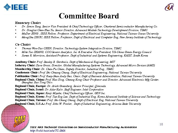 Committee Board Honorary Chairs • • Dr. Simon Yang, Senior Vice President & Chief Technology Officer, Chartered Semiconductor Manufacturing Co. Dr. Douglas Chen-Hua Yu, Senior Director, Advanced Module Technology Development Division, TSMC Mu. Der JENG , IEEE Fellow, Professor, Department of Electrical Engineering, National Taiwan Ocean University Meng. Chu ZHOU, IEEE Fellow, Professor, Dept of Electrical and Computer Eng, New Jersey Institute of Technology Co-Chairs • • • Thomas Wen-Yao CHEN, Director, Technology System Integration Division, TSMC Mike Tao ZHANG, COO Sensor Analytics, Inc & Executive Vice President, US-China Green Energy Council James R. Morrison, Assistant Professor, Dept of Industrial and Systems Engineering, KAIST, South Korea Academy Chair: Prof. Stanley B. Gershwin, Dept of Mechanical Engineering, MIT Industry Chair: Dave Gross, Director, Global Manufacturing Systems Technology, Advanced Micro Devices (AMD) Membership Chair: Dr. Chen-Fu Chien, Deputy Director, Industrial Eng. , TSMC Conference Chair: Prof. Shi-Chuang Chang, Dept of Electrical Engineering, National Taiwan University Publication Chair: Prof. Ruey-Shan Andy Guo, Chair, Dept of Business Administration, National Taiwan University Regional Chair, China: Prof. Han Ding, Cheung Kong Chair Professor and Director, Advanced Electronic Mfg Center, Shanghai Jiao Tong Univ. Regional Chair, Europe: Dr. Arieh Greenberg, Senior Principal, Qimonda Regional Chair, Israel: Dr. Adar Kalir, Staff Engineer, Intel Corporation Regional Chair, Japan: Kenji Miyake, Chief Technology Officer, GEN Inc. Regional Chair, Korea: Prof. Tae-Eog Lee, Dept of Industrial Eng, Korea Advanced Institute of Science and Technology Regional Chair, Taiwan: Prof. Shi-Chung Chang, Dept of Electrical Eng, National Taiwan University Regional Chair, U. S. A. : Prof. John W. Fowler, Dept of Industrial Engineering, Arizona State University IEEE RAS Technical Committee on Semiconductor Manufacturing Automation http: //xs 3 d. kaist. edu/TC-SMA 10