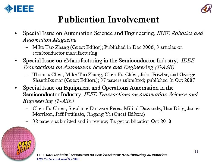 Publication Involvement • Special Issue on Automation Science and Engineering, IEEE Robotics and Automation Magazine – Mike Tao Zhang (Guest Editor); Published in Dec 2006; 3 articles on semiconductor manufacturing • Special Issue on e. Manufacturing in the Semiconductor Industry, IEEE Transactions on Automation Science and Engineering (T-ASE) – Thomas Chen, Mike Tao Zhang, Chen-Fu Chien, John Fowler, and George Shanthikumar (Guest Editors); 37 papers submitted; published in Oct 2007 • Special Issue on Equipment and Operations Automation in the Semiconductor Industry, IEEE Transactions on Automation Science and Engineering (T-ASE) – Chen-Fu Chien, Stephane Dauzere-Peres, Milind Dawande, Han Ding, James Morrison, Jeff Pettinato, Jingang Yi (Guest Editors) – 32 papers submitted and in review; Target publication Oct 2010 IEEE RAS Technical Committee on Semiconductor Manufacturing Automation http: //xs 3 d. kaist. edu/TC-SMA 11