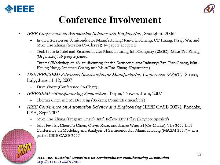 Conference Involvement • IEEE Conference on Automation Science and Engineering, Shanghai, 2006 – – – • 18 th IEEE/SEMI Advanced Semiconductor Manufacturing Conference (ASMC), Stresa, Italy, June 11 -12, 2007 – • Dave Gross (Conference Co-Chair). IEEE/SEMI e. Manufacturing Symposium, Taipei, Taiwan, June, 2007 – • Invited Session on Semiconductor Manufacturing: Fan-Tien Cheng, CC Huang, Naiqi Wu, and Mike Tao Zhang (Session Co-Chairs); 14 papers accepted Tech tours to Intel and Semiconductor Manufacturing Int'l Company (SMIC): Mike Tao Zhang (Organizer); 30 people joined Tutorial/Workshop on e. Manufacturing for the Semiconductor Industry: Fan-Tien Cheng, Min. Hsiung Hung, Jonathan Chang, and Mike Tao Zhang (Organizers) Thomas Chen and Mu. Der Jeng (Steering Committee members) IEEE Conference on Automation Science and Engineering (IEEE CASE 2007), Phoenix, USA, Sept 2007 – – Mike Tao Zhang (Program Chair); Intel Fellow Dev Pillai (Keynote Speaker) John Fowler, Chen-Fu Chien, Oliver Rose, and James Wuerfel (Co-Chairs): The 2007 Int’l Conference on Modeling and Analysis of Semiconductor Manufacturing (MASM 2007) – as a part of IEEE CASE 2007 IEEE RAS Technical Committee on Semiconductor Manufacturing Automation http: //xs 3 d. kaist. edu/TC-SMA 12