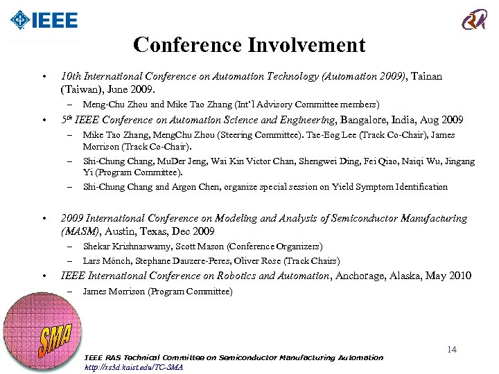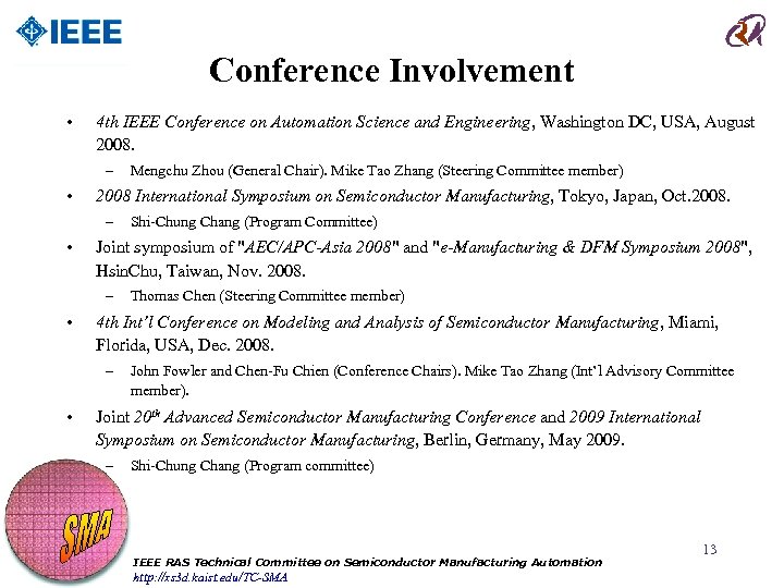 Conference Involvement • 4 th IEEE Conference on Automation Science and Engineering, Washington DC, USA, August 2008. – • 2008 International Symposium on Semiconductor Manufacturing, Tokyo, Japan, Oct. 2008. – • Thomas Chen (Steering Committee member) 4 th Int’l Conference on Modeling and Analysis of Semiconductor Manufacturing, Miami, Florida, USA, Dec. 2008. – • Shi-Chung Chang (Program Committee) Joint symposium of "AEC/APC-Asia 2008" and "e-Manufacturing & DFM Symposium 2008", Hsin. Chu, Taiwan, Nov. 2008. – • Mengchu Zhou (General Chair). Mike Tao Zhang (Steering Committee member) John Fowler and Chen-Fu Chien (Conference Chairs). Mike Tao Zhang (Int’l Advisory Committee member). Joint 20 th Advanced Semiconductor Manufacturing Conference and 2009 International Symposium on Semiconductor Manufacturing, Berlin, Germany, May 2009. – Shi-Chung Chang (Program committee) IEEE RAS Technical Committee on Semiconductor Manufacturing Automation http: //xs 3 d. kaist. edu/TC-SMA 13