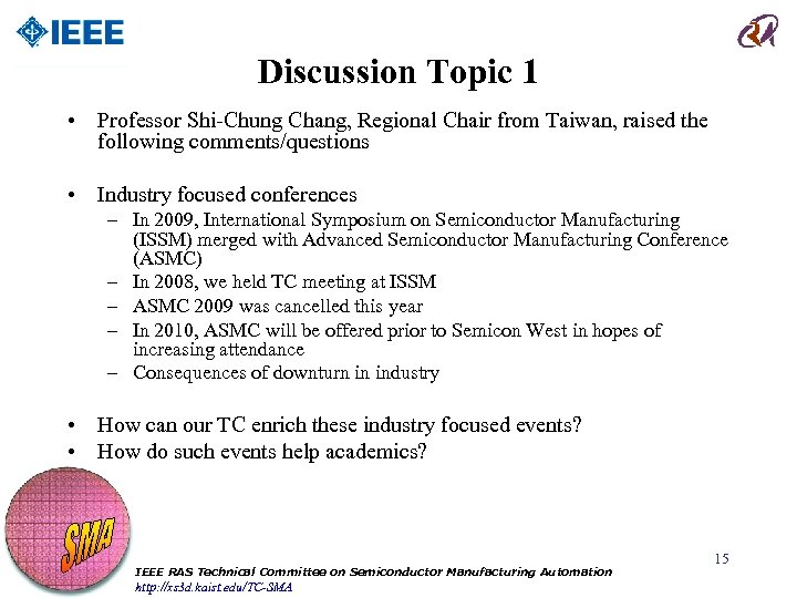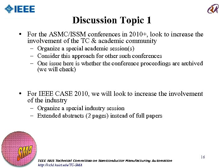 Discussion Topic 1 • Professor Shi-Chung Chang, Regional Chair from Taiwan, raised the following comments/questions • Industry focused conferences – In 2009, International Symposium on Semiconductor Manufacturing (ISSM) merged with Advanced Semiconductor Manufacturing Conference (ASMC) – In 2008, we held TC meeting at ISSM – ASMC 2009 was cancelled this year – In 2010, ASMC will be offered prior to Semicon West in hopes of increasing attendance – Consequences of downturn in industry • How can our TC enrich these industry focused events? • How do such events help academics? IEEE RAS Technical Committee on Semiconductor Manufacturing Automation http: //xs 3 d. kaist. edu/TC-SMA 15