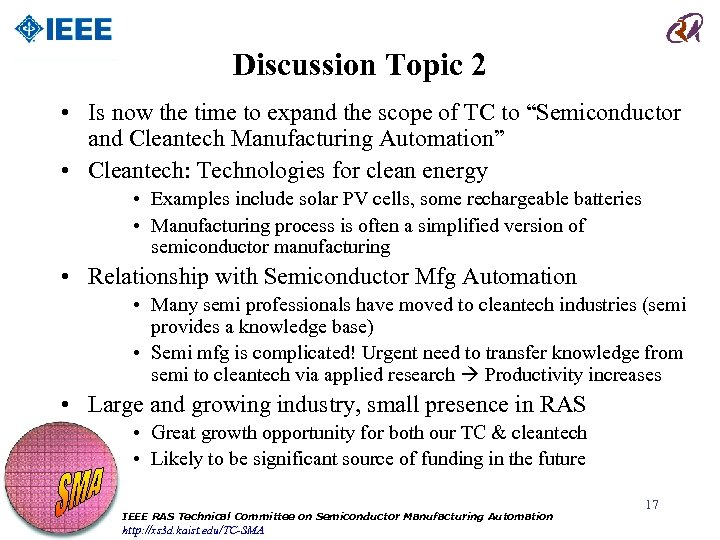 Discussion Topic 2 • Is now the time to expand the scope of TC to “Semiconductor and Cleantech Manufacturing Automation” • Cleantech: Technologies for clean energy • Examples include solar PV cells, some rechargeable batteries • Manufacturing process is often a simplified version of semiconductor manufacturing • Relationship with Semiconductor Mfg Automation • Many semi professionals have moved to cleantech industries (semi provides a knowledge base) • Semi mfg is complicated! Urgent need to transfer knowledge from semi to cleantech via applied research Productivity increases • Large and growing industry, small presence in RAS • Great growth opportunity for both our TC & cleantech • Likely to be significant source of funding in the future IEEE RAS Technical Committee on Semiconductor Manufacturing Automation http: //xs 3 d. kaist. edu/TC-SMA 17
