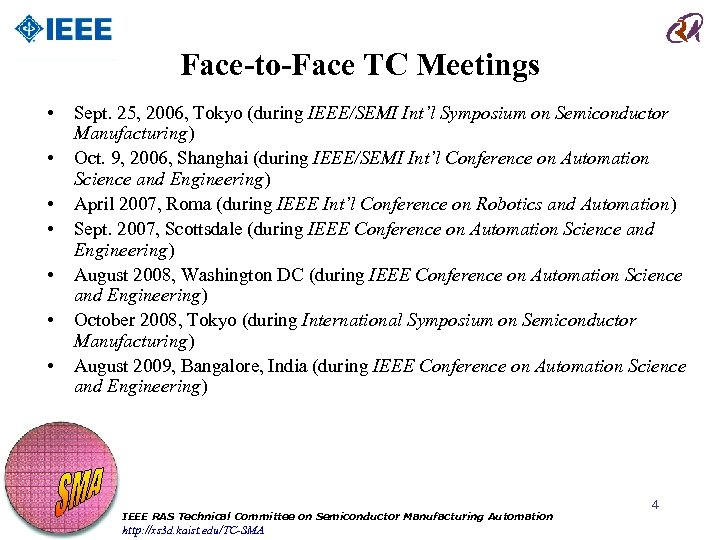 Technical Committee (TC) Brief Data • URL: http: //xs 3 d. kaist. edu/TC-SMA • Founding Date: August 1, 2001 • Scope: – To promote basic and applied research in semiconductor manufacturing and automation – To provide a forum for exchanging ideas among semiconductor manufacturing researchers and engineers – To facilitate related scientific publications and events (such as special conference sessions, workshops, symposia, and special journal issues) IEEE RAS Technical Committee on Semiconductor Manufacturing Automation http: //xs 3 d. kaist. edu/TC-SMA 3