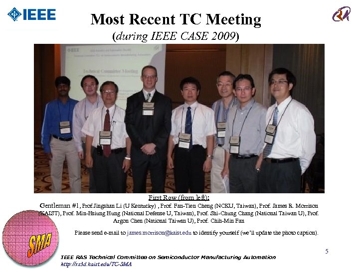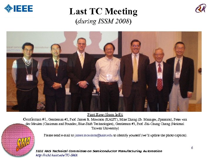 Most Recent TC Meeting (during IEEE CASE 2009) First Row (from left): Gentleman #1, Prof. Jingshan Li (U Kentucky) , Prof. Fan-Tien Cheng (NCKU, Taiwan), Prof. James R. Morrison (KAIST), Prof. Min-Hsiung Hung (National Defense U, Taiwan), Prof. Shi-Chung Chang (National Taiwan U), Prof. Argon Chen (National Taiwan U), Prof. Chih-Min Fan Please send e-mail to james. morrison@kaist. edu to identify yourself (we’ll update the photo caption). IEEE RAS Technical Committee on Semiconductor Manufacturing Automation http: //xs 3 d. kaist. edu/TC-SMA 5