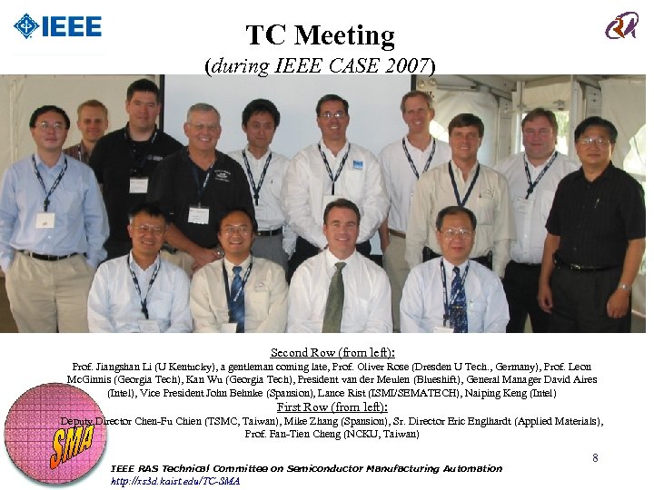 TC Meeting (during IEEE CASE 2007) Second Row (from left): Prof. Jiangshan Li (U Kentucky), a gentleman coming late, Prof. Oliver Rose (Dresden U Tech. , Germany), Prof. Leon Mc. Ginnis (Georgia Tech), Kan Wu (Georgia Tech), President van der Meulen (Blueshift), General Manager David Aires (Intel), Vice President John Behnke (Spansion), Lance Rist (ISMI/SEMATECH), Naiping Keng (Intel) First Row (from left): Deputy Director Chen-Fu Chien (TSMC, Taiwan), Mike Zhang (Spansion), Sr. Director Eric Englhardt (Applied Materials), Prof. Fan-Tien Cheng (NCKU, Taiwan) IEEE RAS Technical Committee on Semiconductor Manufacturing Automation http: //xs 3 d. kaist. edu/TC-SMA 8