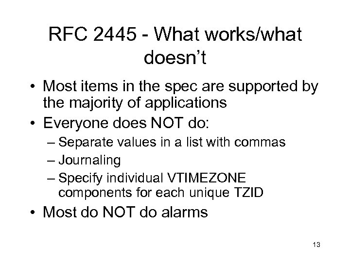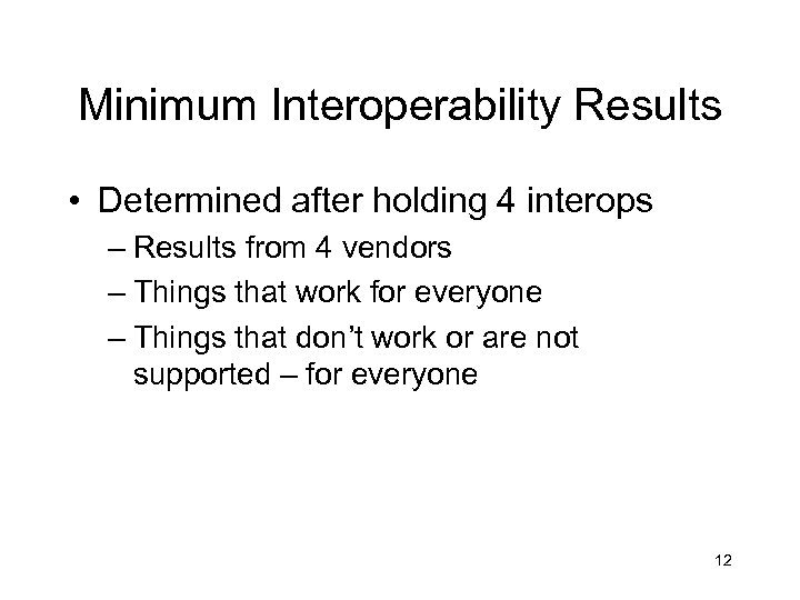 Minimum Interoperability Results • Determined after holding 4 interops – Results from 4 vendors – Things that work for everyone – Things that don’t work or are not supported – for everyone 12