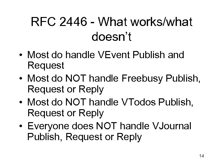 RFC 2445 - What works/what doesn’t • Most items in the spec are supported by the majority of applications • Everyone does NOT do: – Separate values in a list with commas – Journaling – Specify individual VTIMEZONE components for each unique TZID • Most do NOT do alarms 13