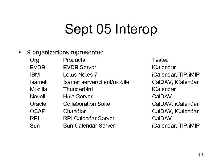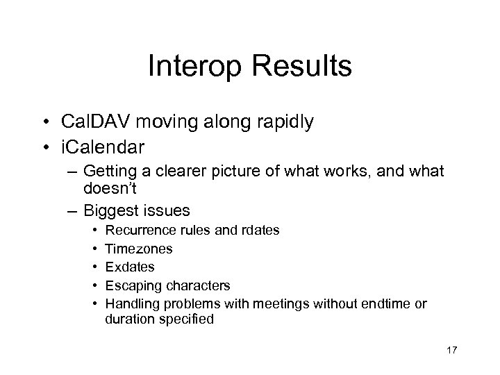 Sept 05 Interop • 9 organizations represented Org EVDB IBM Isamet Mozilla Novell Oracle OSAF RPI Sun Products EVDB Server Lotus Notes 7 Isamet server/client/mobile Thunderbird Hula Server Collaboration Suite Chandler RPI Calendar Server Sun Calendar Server Tested i. Calendar, i. TIP, i. MIP Cal. DAV, i. Calendar Cal. DAV i. Calendar, i. TIP, i. MIP 16