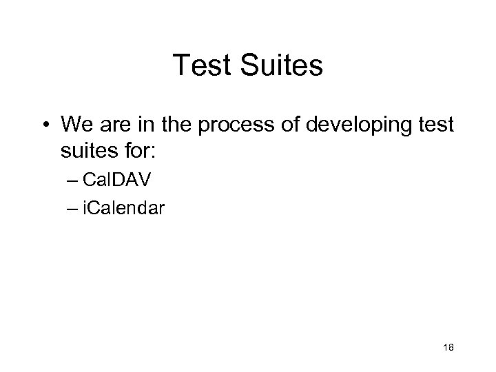 Test Suites • We are in the process of developing test suites for: – Cal. DAV – i. Calendar 18