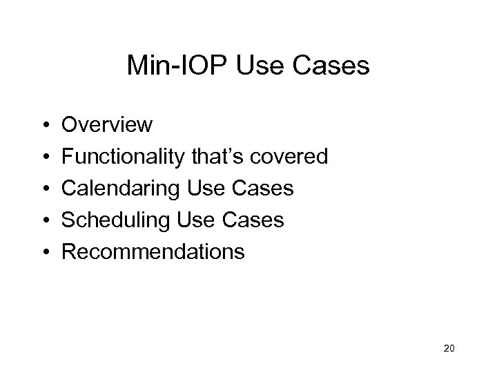 Min-IOP Use Cases • • • Overview Functionality that’s covered Calendaring Use Cases Scheduling Use Cases Recommendations 20