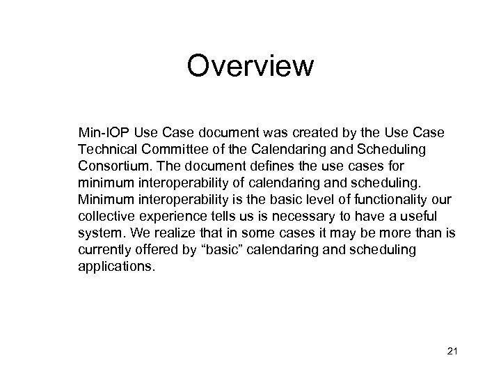 Overview Min-IOP Use Case document was created by the Use Case Technical Committee of the Calendaring and Scheduling Consortium. The document defines the use cases for minimum interoperability of calendaring and scheduling. Minimum interoperability is the basic level of functionality our collective experience tells us is necessary to have a useful system. We realize that in some cases it may be more than is currently offered by “basic” calendaring and scheduling applications. 21