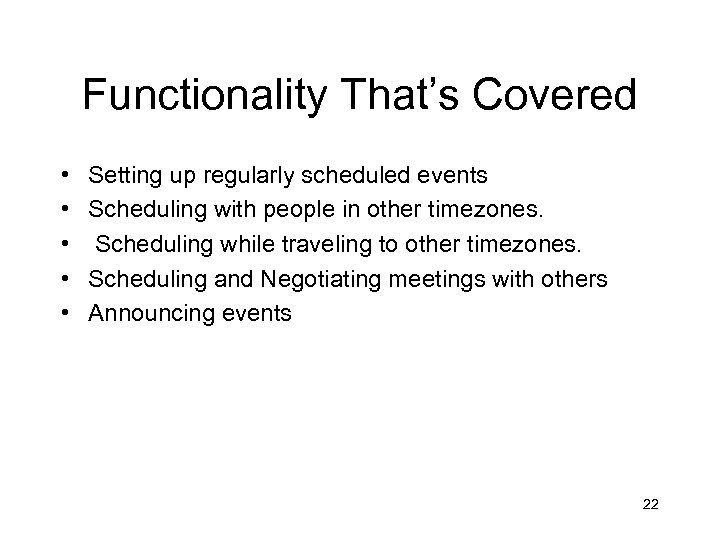 Functionality That’s Covered • • • Setting up regularly scheduled events Scheduling with people in other timezones. Scheduling while traveling to other timezones. Scheduling and Negotiating meetings with others Announcing events 22