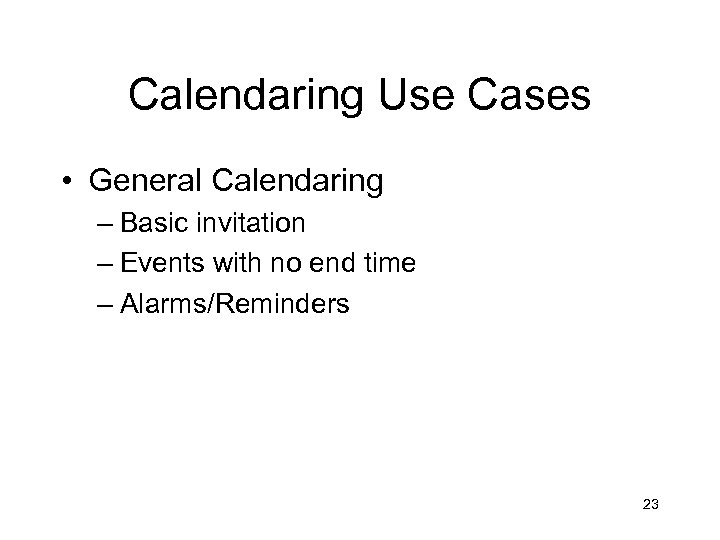 Calendaring Use Cases • General Calendaring – Basic invitation – Events with no end time – Alarms/Reminders 23
