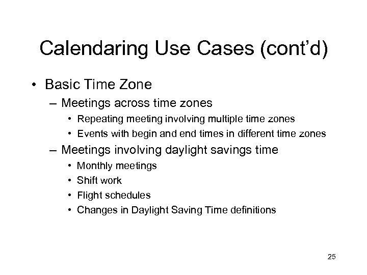 Calendaring Use Cases (cont’d) • Basic Recurrence (Intervals) For the basic recurrence intervals below, a calendar user/organizer may wish to create meetings/events that are unbounded, i. e. no clear end date. Some examples include birthdays, anniversaries, staff meetings. While different implementations may or may not allow creation of these types of meetings/events, the unboundedness should be retained when the meeting/event is transferred between systems. – – – Every Nth interval Day of week/month Nth date of month Custom list of dates Basic combinations Exceptions 24
